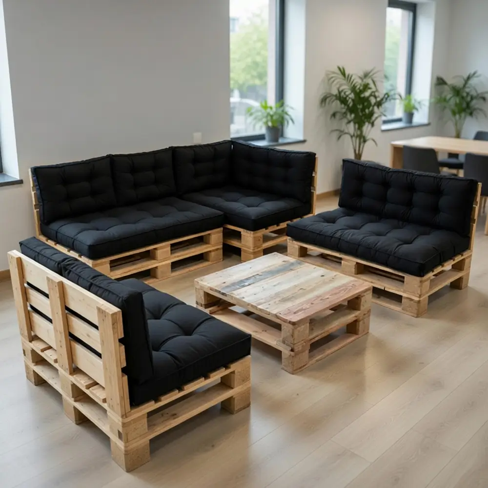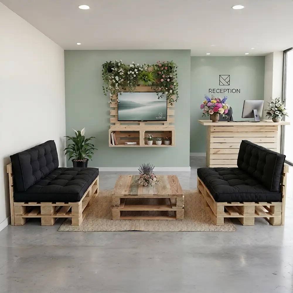 O desafio é criar esse ambiente com mobiliário que aguente o uso intenso de um espaço corporativo, tenha uma estética consistente e não exija um projeto de interiores para parecer planejado. O kit espaço gourmet industrial da Pallet SP resolve esse problema com quatro peças complementares em ferro e madeira pinus, fabricadas na mesma linha de produção e pensadas para funcionar juntas.