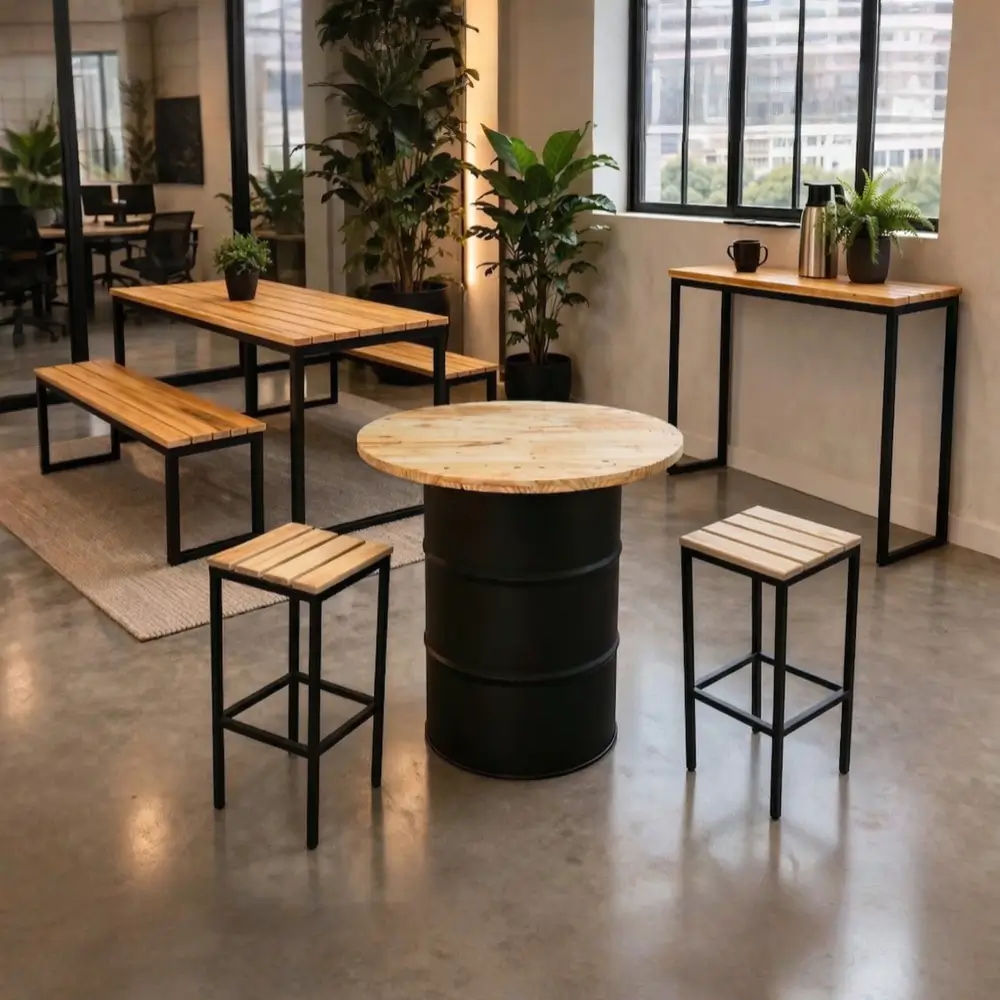 A mesa tambor de 200 litros é a peça de maior impacto visual do conjunto. Fabricada com um tambor metálico de 200 litros recondicionado e tampo circular de 90 cm em madeira pinus vernizada, ela funciona como mesa alta para conversas rápidas, ponto de apoio para bebidas em eventos ou simplesmente como elemento de design que chama atenção e gera conversa. O tambor passa por processo de limpeza e pintura antes da montagem, chegando higienizado e pronto para uso.