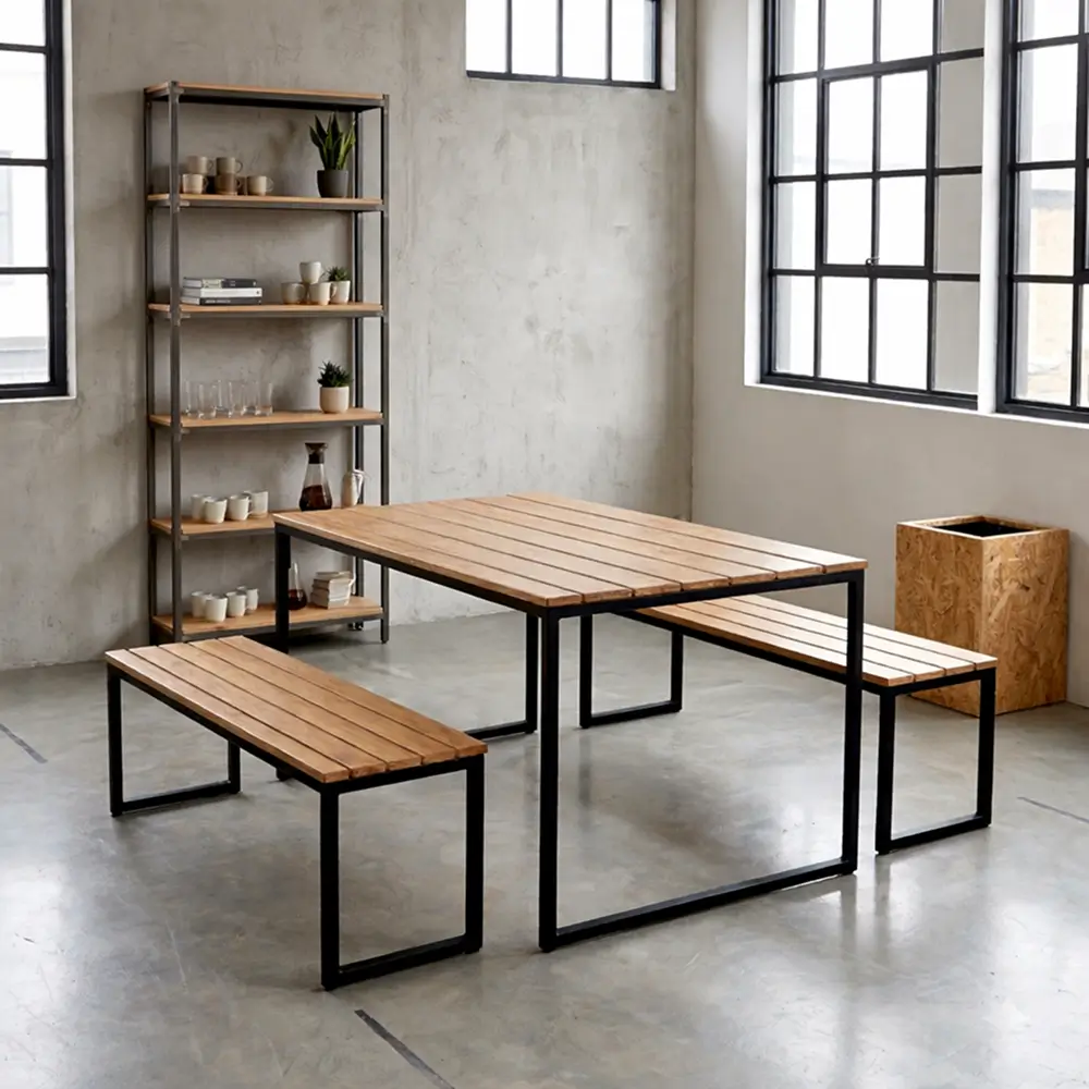 O mobiliário industrial — estrutura metálica com madeira — não é apenas uma tendência de decoração. É uma escolha que parte de um princípio prático: materiais que foram desenvolvidos para ambientes de alta exigência têm desempenho superior em espaços de uso intenso.