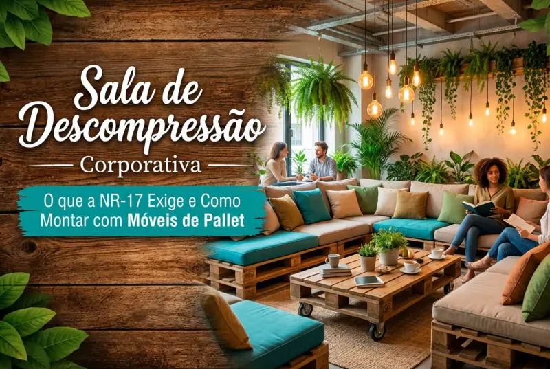 Neste artigo você vai entender o que a NR-17 realmente exige sobre descanso no ambiente de trabalho, por que empresas brasileiras têm investido em salas de descompressão além do que a legislação determina, e como a Pallet SP oferece móveis sob medida para montar esses espaços com qualidade, identidade visual e custo controlado.